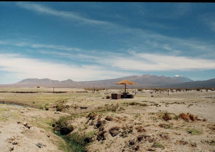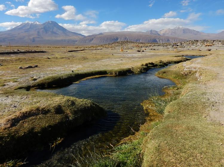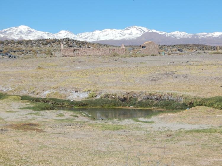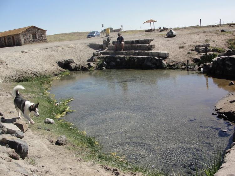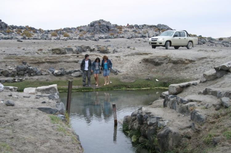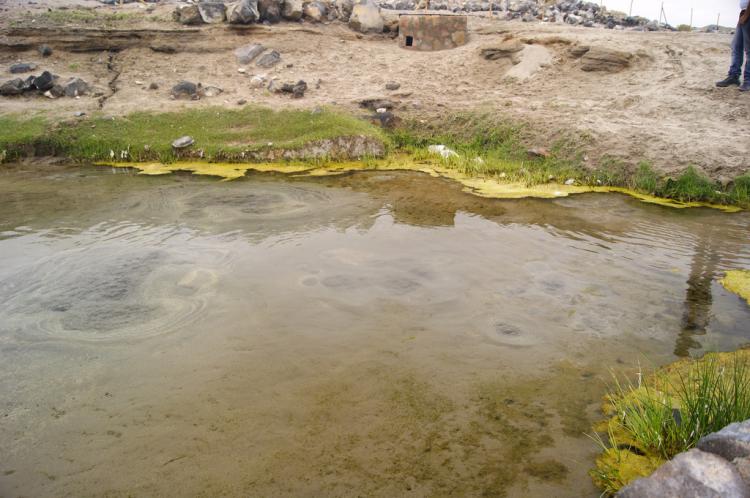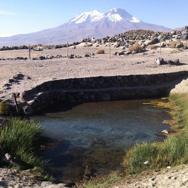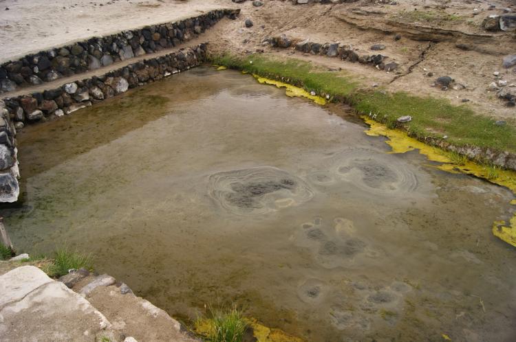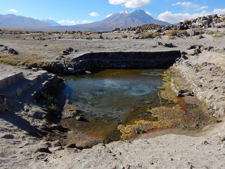 Afloración natural de agua tibia, olor azufroso y un fondo arenoso de color negro muy intenso. El agua está contenida en una rústica piscina, cerrada por tres lados, dejando fluir el líquido hacia las vegas del sector, en que pastan llamas y vicuñas. Hay algunas viviendas cercanas en que se aprecia la roca negra del lugar con que se construyen las casas y las pircas de los corrales.